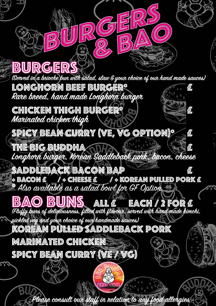 Our BBQ Buddha brand typically offers a menu of burgers & bao buns with a selection of homemade sauces, though we offer many more unique foods under our Buddha Events Presents…. brand (click here). Our fluffy bao buns are freshly prepared and steamed on site, then served with a zingy handmade kinchi, pickled red cabbage. Our burgers are all handmade to our unique recipe, then served in a toasted demi-brioche bun, salad, purple slaw, pickles and lashings of sauce. We are continually experimenting with different fusions to deliver awesome flavours which literally explode in your mouth.